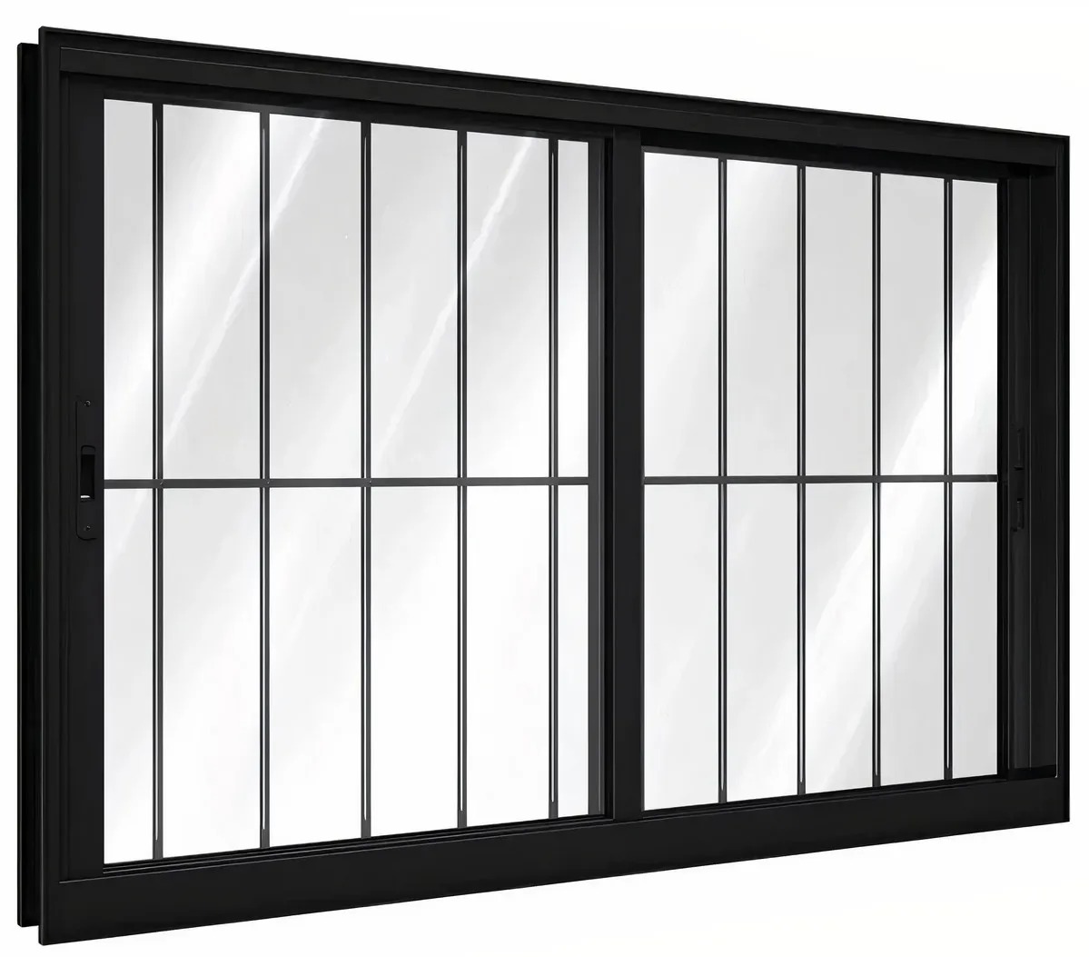 O acabamento em alumínio preto proporciona um design sofisticado que combina perfeitamente com diversos estilos de construção, desde projetos residenciais até comerciais. Além disso, a grade integrada oferece mais proteção e tranquilidade, sendo ideal para casas, apartamentos e áreas externas.